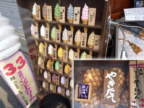 花月堂のソフトクリームは33種類もあります。えだ豆や八丁味噌などの珍しい味も。かき氷も充実しています。
